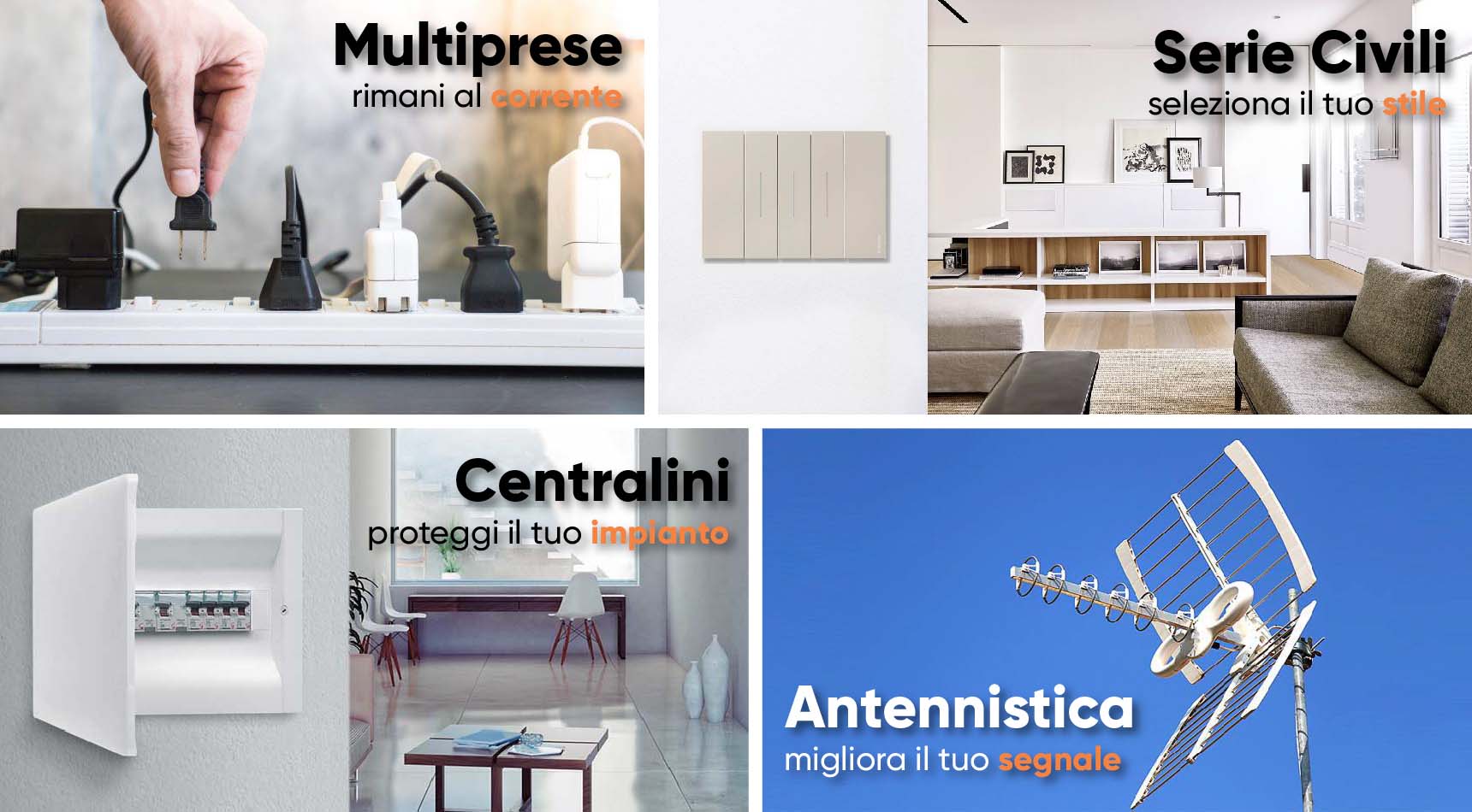 Serie civili, centralini, magnetotermici, prese spine e multiprese, antennistica terrestre e satellitare...